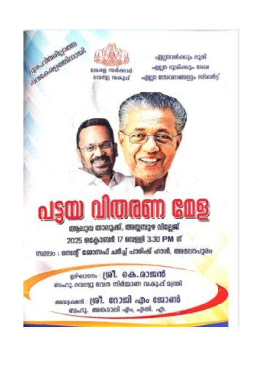 അയ്യമ്പുഴ : ആലുവ താലൂക്ക് അയ്യമ്പുഴ വില്ലേജിലെ പാണ്ടുപാറ നിവാസികളിൽ അർഹരായവർക്കുള്ള പട്ടയ വിതരണം ഇന്ന് നടക്കും. അമലാപുരം സെന്റ് ജോസഫ് ചർച്ച് പാരിഷ് ഹാളിൽ ഇന്ന് ഉച്ചക്ക് ശേഷം നടക്കുന്ന ചടങ്ങിൽ അങ്കമാലി എം.എൽ.എ റോജി എം ജോൺ അധ്യക്ഷത വഹിക്കും. റെവന്യൂ ഭവന നിർമാണ വകുപ്പ് മന്ത്രി കെ രാജൻ മേളയുടെ ഉദ്ഘാടനവും പട്ടയ വിതരണവും നിർവഹിക്കും. ചാലക്കുടി എം.പി ബെന്നി ബെഹനാൻ, ജെബി മേത്തർ എം.പി, അൻവർ സാദത്ത് എം എൽ എ, ജില്ലാ പഞ്ചായത്ത് പ്രസിഡന്റ് മനോജ് മൂത്തേടൻ തുടങ്ങിയവർ പങ്കെടുക്കും.